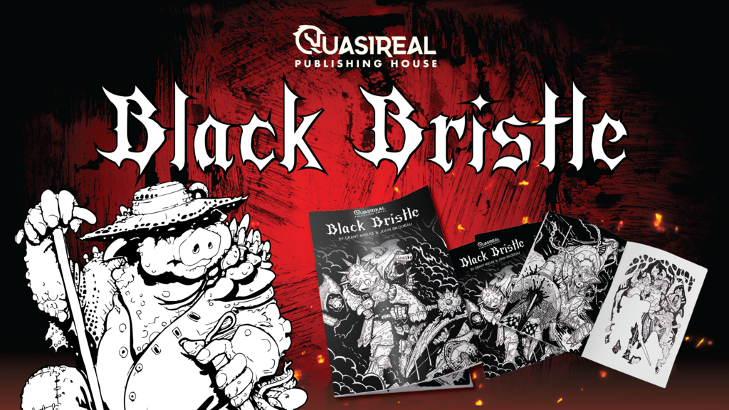 Black Bristle is a grimy, blood-slicked dungeon crawl for MythCraft. Part satire, part slaughterhouse, it drags the classic OSR orc trope into a world of grease, smoke, and meat-grinder brutality.